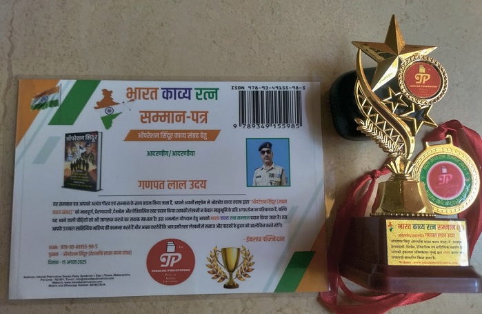 भारतीय सेना के अदम्य साहस “ऑपरेशन सिंदूर” पर आधारित देशभक्ति साझा काव्य संग्रह में राष्ट्रप्रेम से ओतप्रोत काव्य रचनाओं हेतु सैनिक कवि गणपत लाल उदय को इंकलाब पब्लिकेशन (महाराष्ट्र) द्वारा “भारत काव्य रत्न सम्मान” से सम्मानित किया गया।