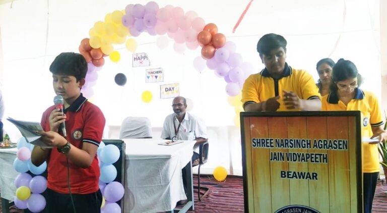 श्री वर्द्धमान समिति द्वारा संचालित श्री नृसिंह अग्रसेन जैन विद्यापीठ, सेंदड़ा रोड, में आज विद्यार्थियों ने शिक्षक दिवस मनाया। इस अवसर पर प्रधानाचार्या डॉ निवेदिता पाठक, उपप्रधानाचार्य श्री नागेश राठौड़ , कार्यालय अधीक्षक श्री अजय चौधरी ने सरस्वती मां के के समक्ष माल्यार्पण कर प्रज्वलन किया। विद्यार्थियों ने शिक्षकों का तिलक ,माला, कार्ड और चाकलेट के साथ सम्मान किया। विद्यार्थियों द्वारा भाषण , नृत्य और गायन प्रस्तुत किया गया और साथ ही विभिन्न प्रकार के रोचक खेल भी खेले। शिक्षकों ने भी अपने विचार भाषण और गायन के माध्यम से प्रस्तुत किए।